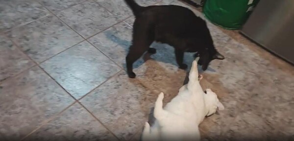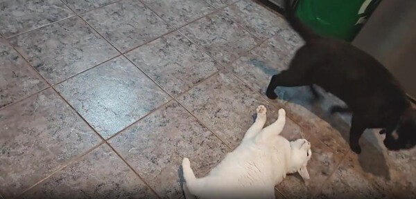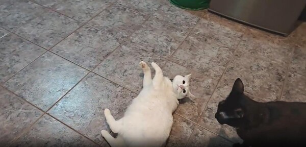 차가운 타일 바닥 위, 흰 고양이 한 마리가 느긋하게 누워 있었습니다. 마치 세상에서 가장 편안한 자세로 뒹굴던 그때, 검은 고양이 한 마리가 조용히 다가왔지요. 조심스럽지만 묘하게 도발적인 눈빛. 흰 고양이도 그 눈빛을 놓치지 않았습니다.