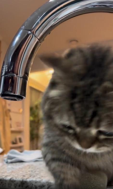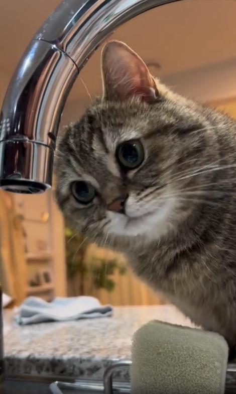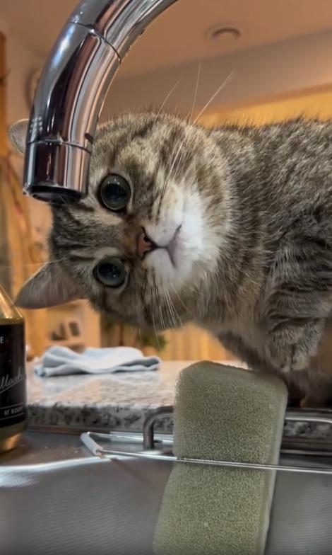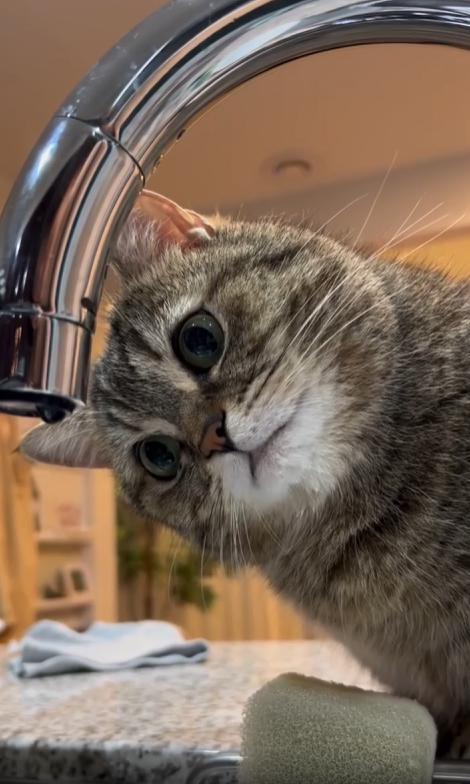 출처 : Reddit / 고양이가 수도꼭지에 물방울이 맺혀 떨어지는걸 관심있게 바라본다 떨어지는 물을 앞발로 쳐보기도 한다