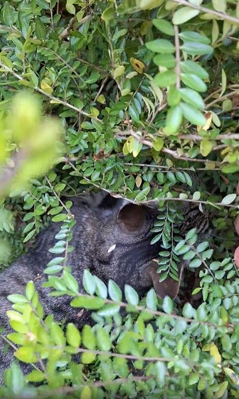 척입니다. 푸르른 잎들이 만들어낸 그늘 아래, 그는 더위로부터 완벽히 자신을 숨기고 있었죠. 잎 사이로 스며드는 햇살이 얼룩 그림자를 드리운 얼굴 위로, 척은 묵묵히 주인을 바라봅니다. 숨은 듯하지만 놀란 기색은 없고, 오히려 “이런 더운 날엔 이 정도 쿨링은 기본이지”라는 여유로운 표정입니다.
