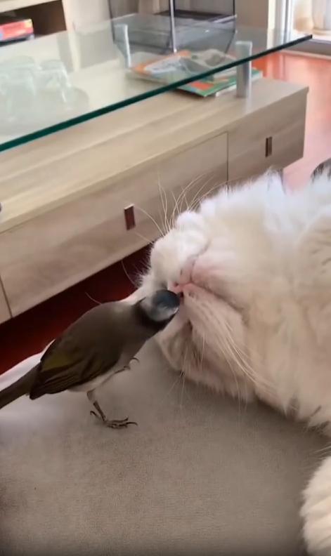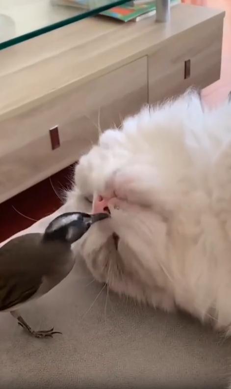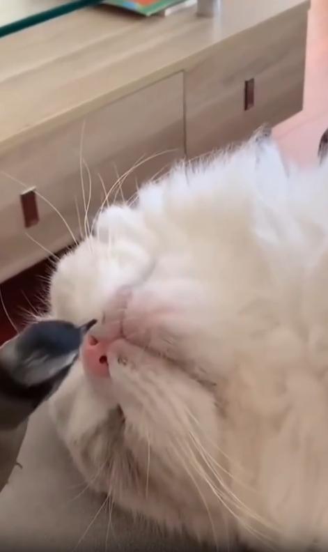 그리고 그 옆, 믿기 힘든 장면이 펼쳐집니다. 작은 새 한 마리가 고양이의 코 주변을 진지한 표정으로 쪼고 있는 겁니다. 콧망울 근처부터 시작해, 콧등, 심지어 콧구멍 주변까지—매우 섬세한 동작으로 조심스럽게 다가갔다가 톡톡. 마치 고양이의 얼굴을 관리해주는 전문가처럼, 작은 부리로 아주 조심스럽게 움직입니다.