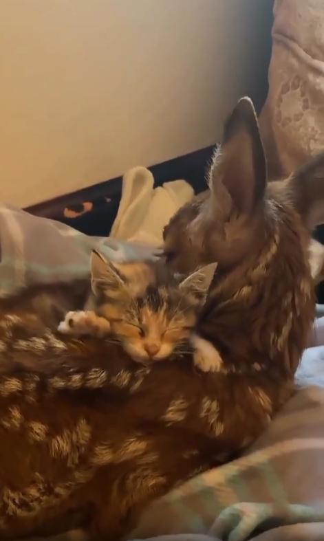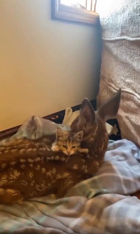 이 새끼 고양이, 어쩐지 호기심이 가득한 눈빛으로 사슴을 바라보다가 천천히 앞발을 올려 목 부근을 톡, 하고 건드립니다. 그리곤 두 앞발을 번갈아 들며 사슴의 목을 움켜쥐듯 쥐었다 폈다를 반복하죠. 무언가를 꼭 확인하고 싶은 듯, 마치 “이거 진짜 살아있는 거 맞지?”라고 묻는 듯한 모습입니다.