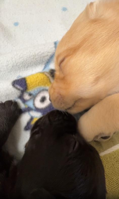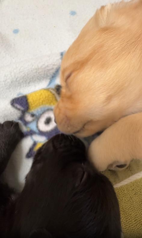 작은 담요 위, 살포시 몸을 기대어 잠든 두 마리 새끼 강아지. 노란빛의 강아지와 검은빛의 강아지는 서로의 주둥이를 꼭 맞댄 채, 마치 오랜 친구처럼 깊은 꿈속을 걷고 있습니다. 그 모습은 꼭 아이들이 귓속말로 비밀 이야기를 나누다 잠든 것 같았죠.
