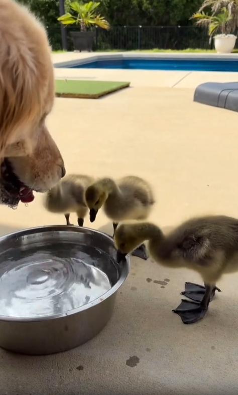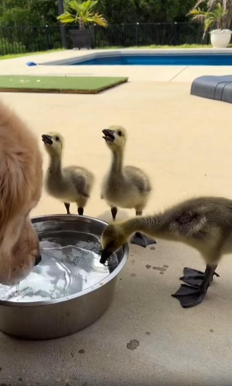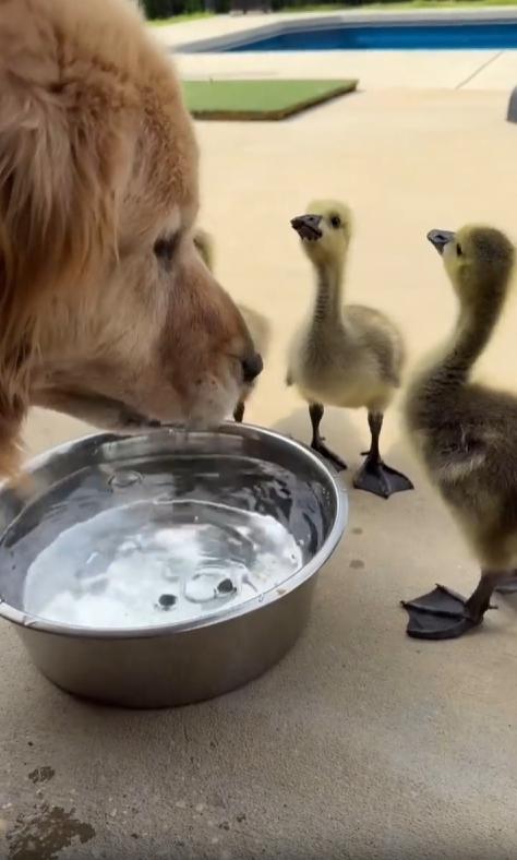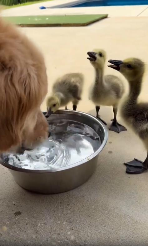 출처 : Reddit / 골든리트리버와 새끼오리3마리가 물그릇에 담긴물을 같이 먹고있다
