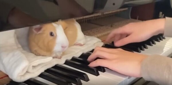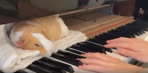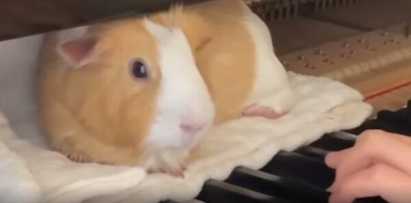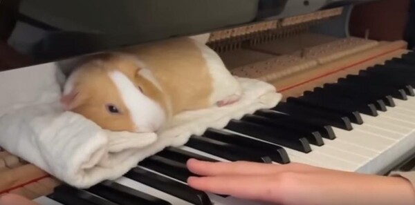 피아노 건반 위에 조심스럽게 덮인 수건, 그 위에 앉아 있는 건 바로 작은 기니피그였습니다. 두 눈을 동그랗게 뜬 채 가만히 앉아 있는 모습은 마치 음악회를 감상하는 관객처럼 보였습니다.