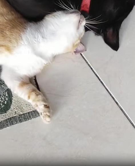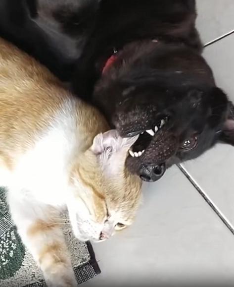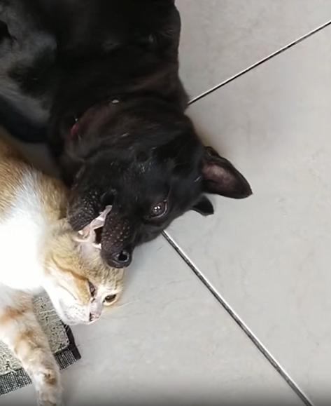 출처 : Reddit / 강아지와 고양이가 나란히 누워있다 강아지가 고양이의 귀를 살짝 깨물기 시작하자 고양이가 앞발로 강아지를 쳐낸다 하지만 강아지는 다시 고양이귀를 물기시작한다 고양이는 포기했다