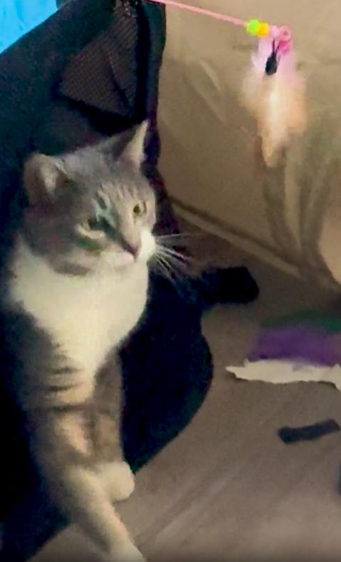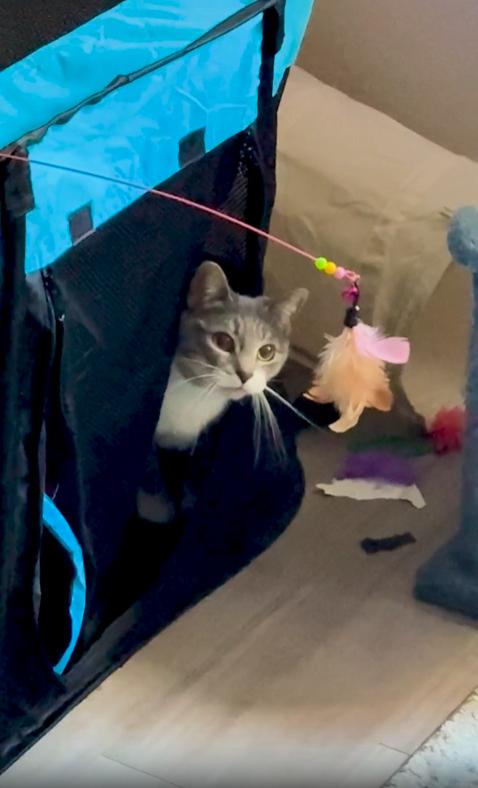 출처 : Reddit / 이동형 고양이 박스안에 고양이가 있다 지퍼로 된 문 밖에는 장난감이 걸려있고 열린지퍼로 살짝 고양이 얼굴이 보더니 앞발로 장난감을 툭툭 치기 시작한다