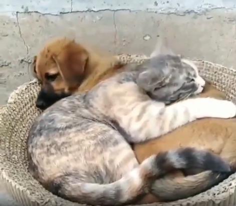 출처 : Reddit / 작은 바구니안에 강아지가 옆으로 편하게 누워있다 잠시후 고양이가 다가와 바구니안에 들어와 편한 자세로 눕는다