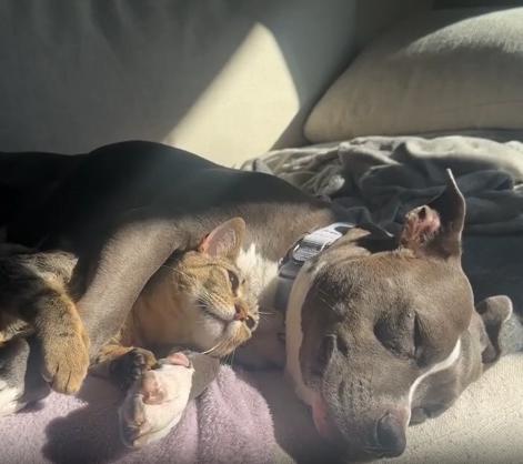 강아지는 고양이의 이 느닷없는 행동에 놀라거나 불편해하는 기색이 없습니다. 오히려 아무 일도 없었다는 듯, 그 앞발을 살짝 더 느슨하게 늘어뜨려 고양이의 머리를 더 안정감 있게 받쳐주기까지 합니다. 고양이는 그 위에서 눈을 지그시 감고 가늘게 숨을 쉬며, 마치 ‘이곳이 오늘의 가장 안전한 자리에요’라고 말하는 듯 보입니다. 고양이의 꼬리는 천천히 흔들리고, 강아지의 숨결은 귓가를 부드럽게 간질입니다.