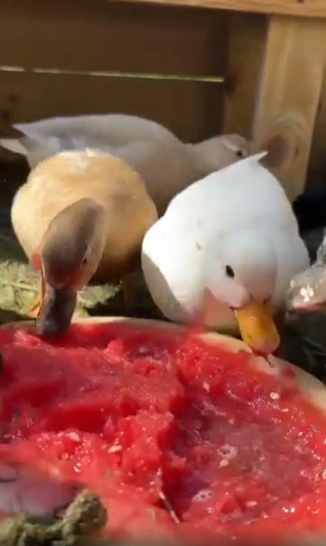 첫 부리를 대는 오리는 여유롭게, 마치 자리를 맡아둔 듯 수박에 입을 댑니다. 이어지는 오리들도 각자의 위치에서 자신의 몫을 찾듯 수박에 파고듭니다. 붉은 과육이 순식간에 촘촘히 깎이고, 껍질만 남은 가장자리엔 물방울이 송글송글 맺힙니다. 누가 시키지 않아도 서로를 방해하지 않는 이 질서. 그 모습이 어쩐지 경건하게까지 느껴집니다.