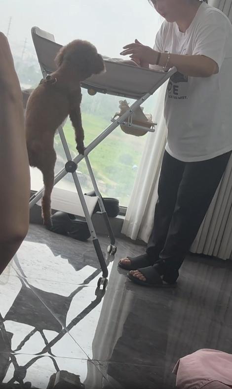출처 : Reddit /  작은 아기침대 앞에서서 아기를 돌보고 있는 엄마 그옆에는 강아지가 아기를 보고싶은듯 깡총 깡총 뛰고있다