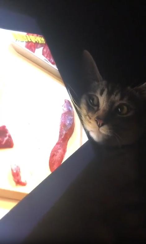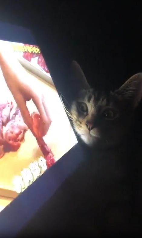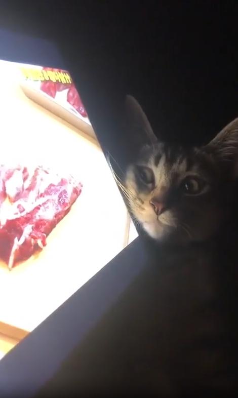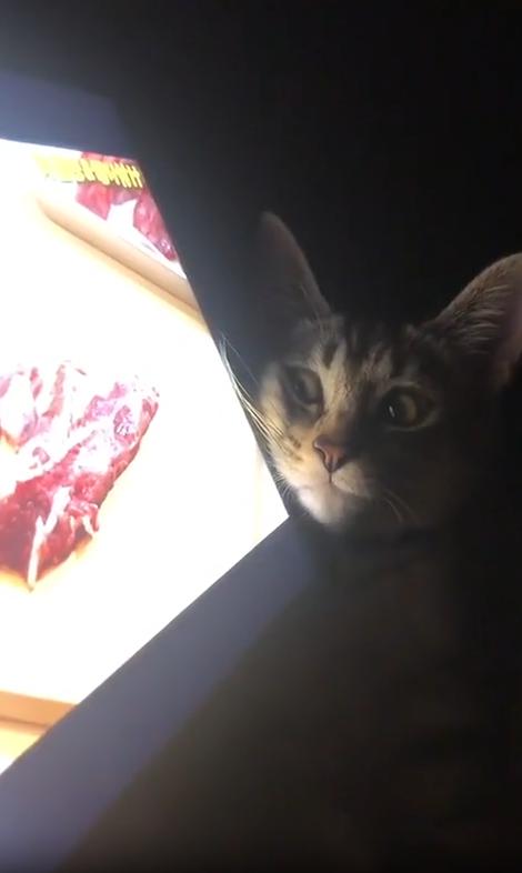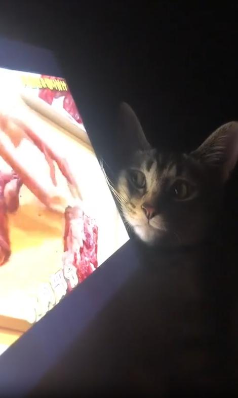 출처 : Reddit / 불꺼진 실내 화면에서는 고기를 써는 장면이 나오고 있고 고양이가 tv옆에 바짝 고개를 대고 붙어서 고기가 떨어지길 기다린다