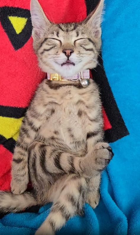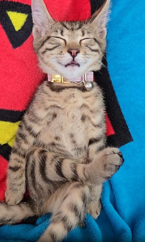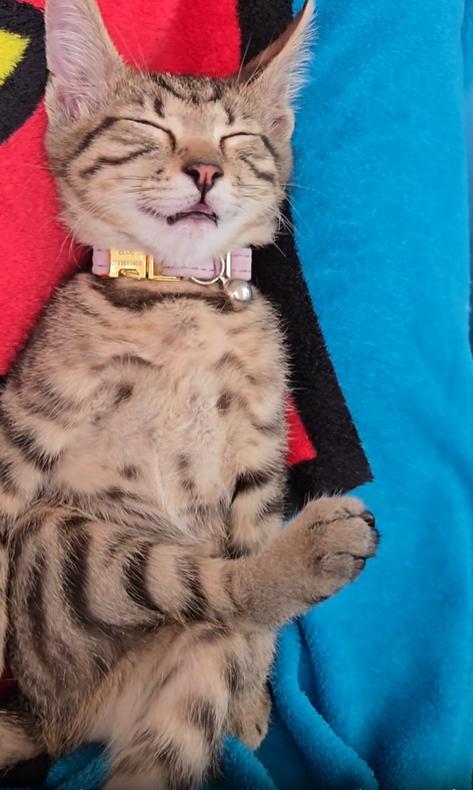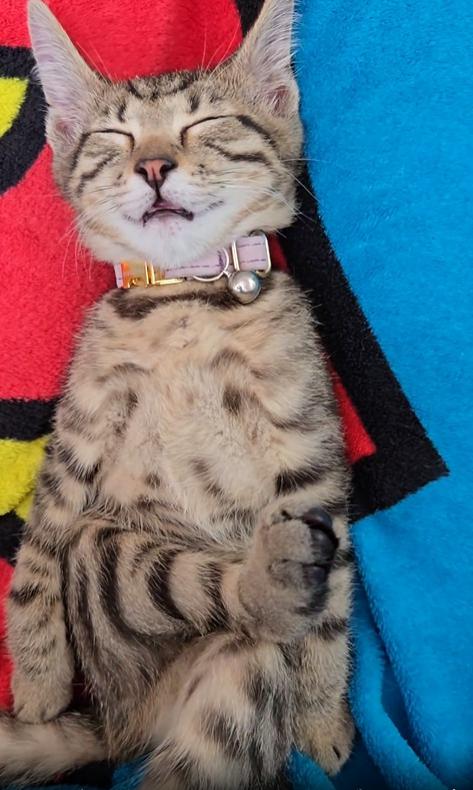 고양이는 등을 바닥에 대고 배를 하늘로 드러낸 채로 누워 있습니다. 여느 고양이들처럼 네 다리를 자연스럽게 벌리고 있는 것도 아니고, 경계심을 풀지 않은 채 웅크려 있는 것도 아니죠. 이 아이는 아예 한쪽 뒷발을 다른 뒷발에 우아하게 걸쳐둔 채 잠들어 있습니다. 마치 조용한 오후, 해변의 썬베드에 누워 다리를 꼬고 낮잠을 즐기는 휴양객처럼요.