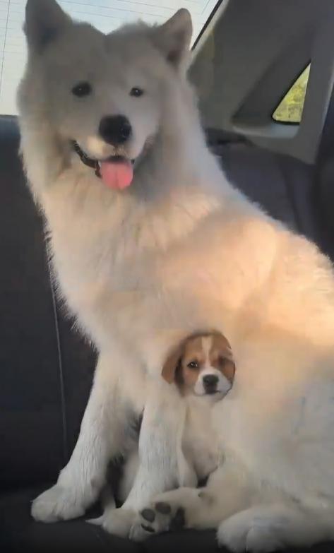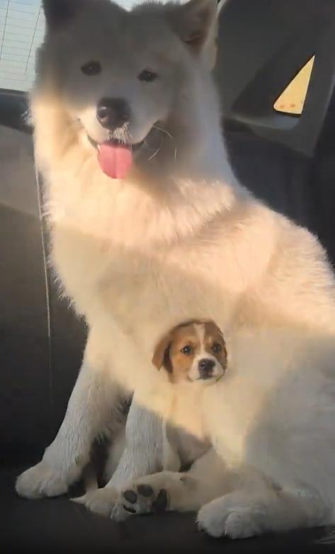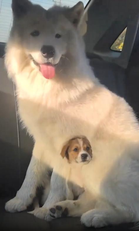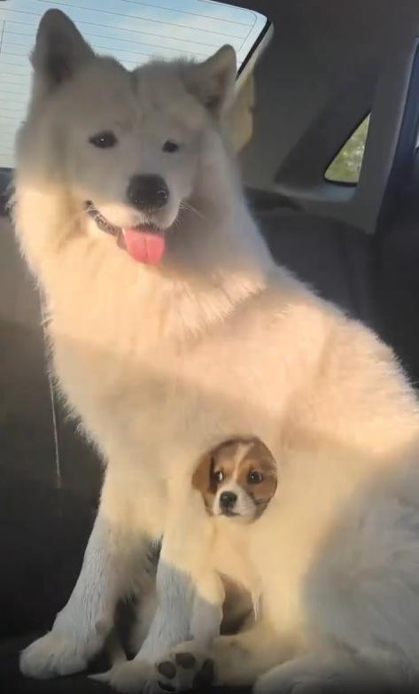 출처 : Reddit / 달리는 차안 좌석에는 큰 사모예드가 앉아있고 사모예드 아래쪽에는 작은 강아지가 사모예드 털안에서 고개만 내밀고있다