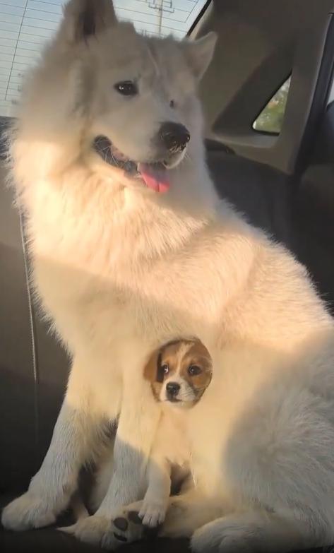 그 자체로도 눈부시게 아름다운 이 사모예드. 그런데 그 털 사이, 무언가 낯선 것이 살짝 움직입니다. 자세히 보니 그 포근한 털 속에서 조그마한 강아지가 얼굴을 쏙 내밀고 세상을 구경하고 있었어요.