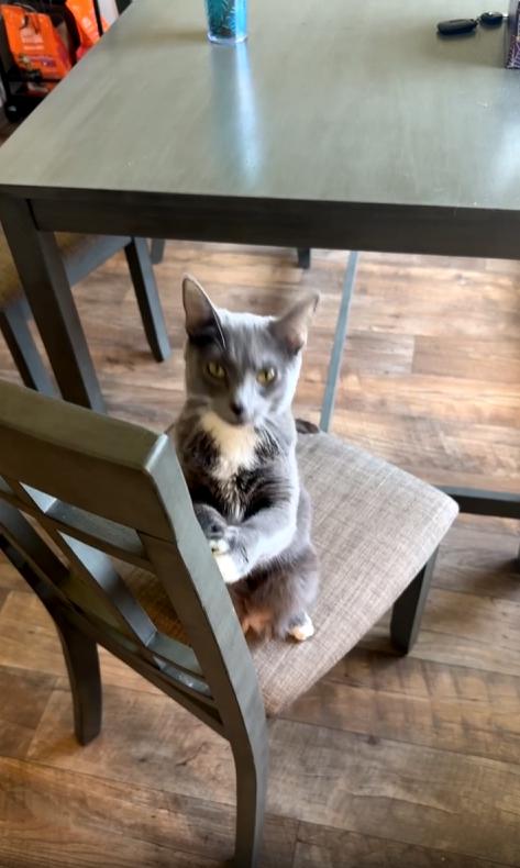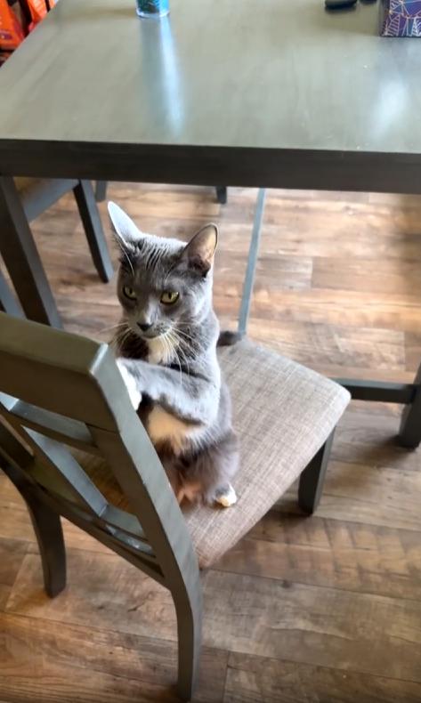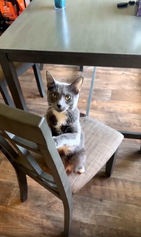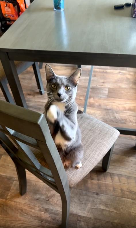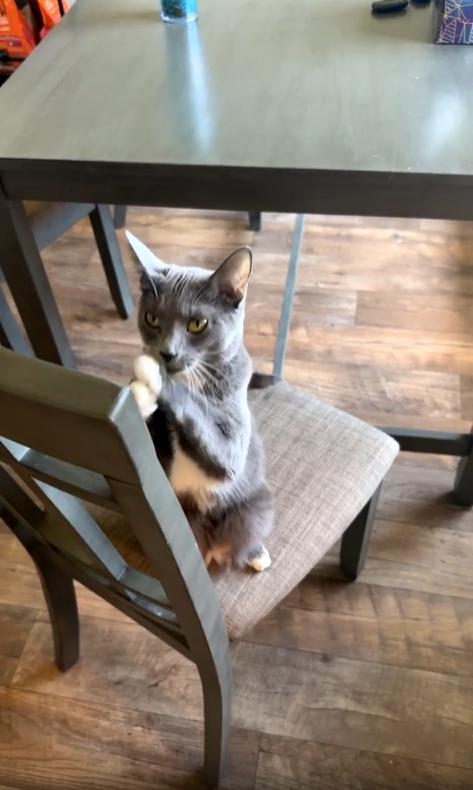 짙은 회색 털에 고운 흰 장갑을 낀 듯한 앞발. 의자 위에 앉아 있던 고양이는 주변을 살피더니 갑자기 뒷발로 꼿꼿이 일어섰습니다. 균형을 잃지 않으려는 듯 꼬리를 가볍게 의자에 기대고, 두 앞발을 번갈아 위아래로 흔들기 시작했지요. 꼭 누군가에게 “안녕~” 하고 손을 흔드는 모습처럼 보였습니다. 그 눈빛은 장난기가 가득하면서도, 한편으로는 무언가 말을 걸고 싶은 듯 진지했습니다.
