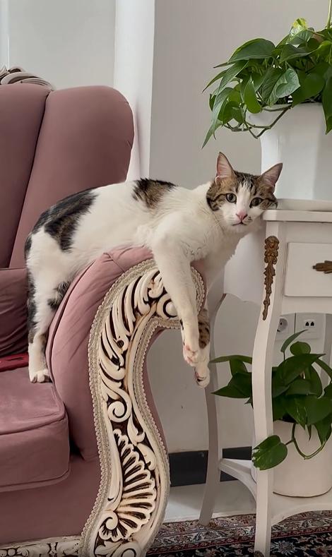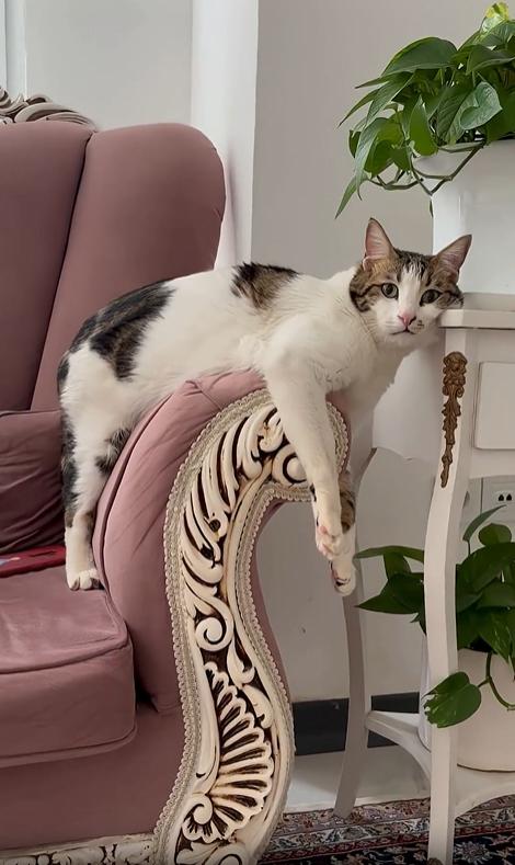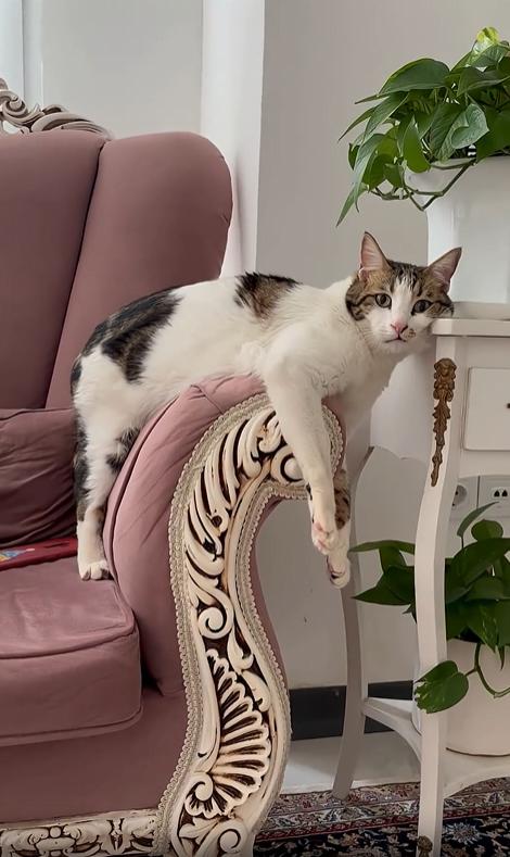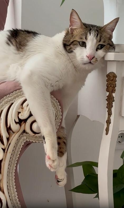 한낮의 햇살이 거실을 부드럽게 감싸고 있던 어느 순간, 소파 옆 테이블에는 뜻밖의 ‘예술 작품’이 완성되고 있었습니다. 바로 한 마리 고양이의 독창적인 식빵자세 덕분이었죠. 소파의 팔걸이에 배를 걸친 채로 몸을 폭 감싸 안고, 고개는 옆에 붙어 있는 테이블 위로 살포시 기대고 있는 그 모습. 마치 테이블과 소파가 고양이를 위한 맞춤형 안마의자라도 되는 양 완벽하게 몸을 받쳐주고 있었습니다.