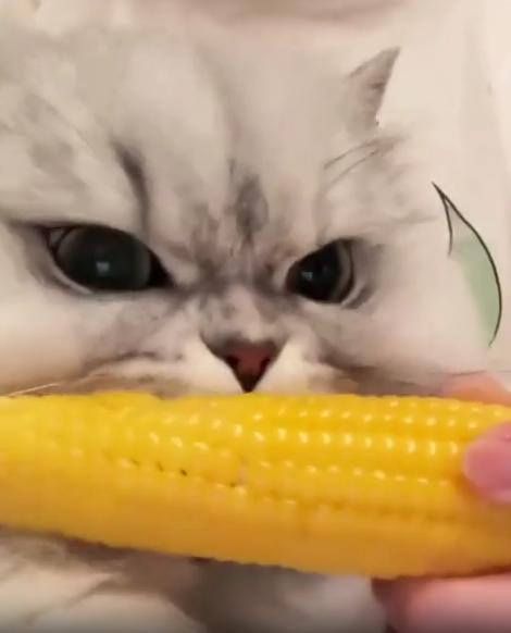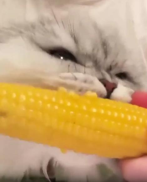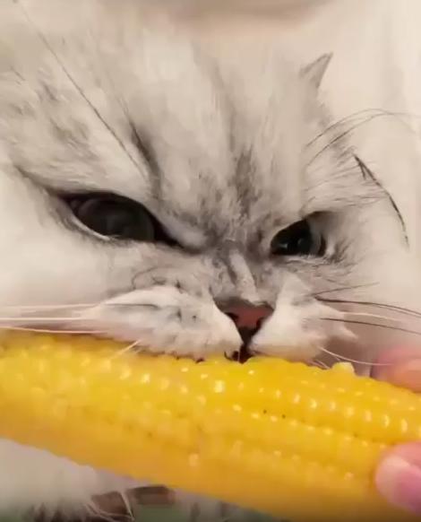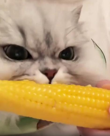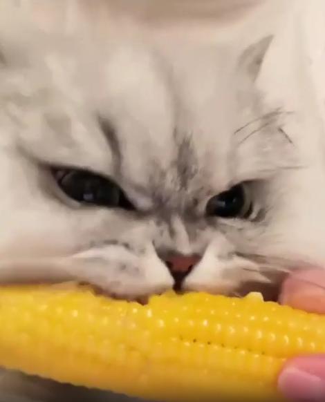 그런데 그 표정을 한 채, 고양이는 옥수수를 한입—! 퍽 하고 베어무는 순간, 눈빛은 더 날카로워졌습니다. "왜 이렇게 맛있어?"라고 말하는 듯한 당황, 혹은 “네가 내 기분 나쁜 걸 알고도 이렇게 달콤하단 말이지?”라는 배신감 섞인 감정이 그대로 얼굴에 드러났습니다. 이건 단순한 간식 시간이 아니라, 감정의 소용돌이 속으로 들어간 고양이의 본격적인 먹방이었죠.