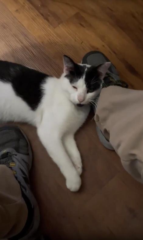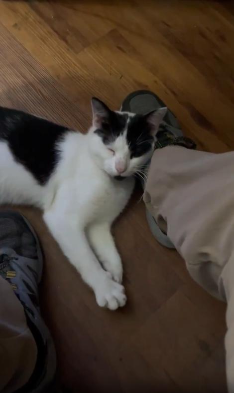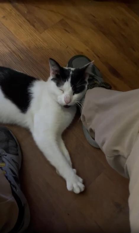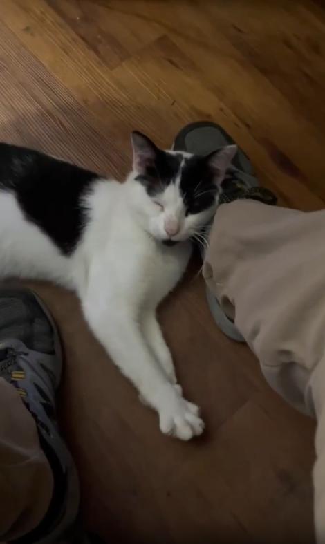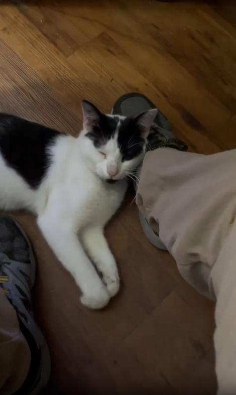 고양이는 신중한 존재입니다. 아무 데서나 잠들지 않고, 아무를 베개 삼지도 않죠. 그런데 이 고양이는 선택했습니다. 바로 신발을 신은 채 앉아 있는 주인의 발을—아니, 그 발 위에 얹힌 운동화를 ‘베개’ 삼아 옆으로 누워 잠드는 장면은 묘하게 웃기면서도 따뜻했습니다. 고양이는 고개를 푹 신발에 기댄 채 눈을 감고 있었고, 그 작은 앞발은 꿈속에서도 무언가를 꾹꾹 누르듯 허공을 향해 움직이고 있었습니다. 꼭 부드러운 담요를 밟는 것처럼요.