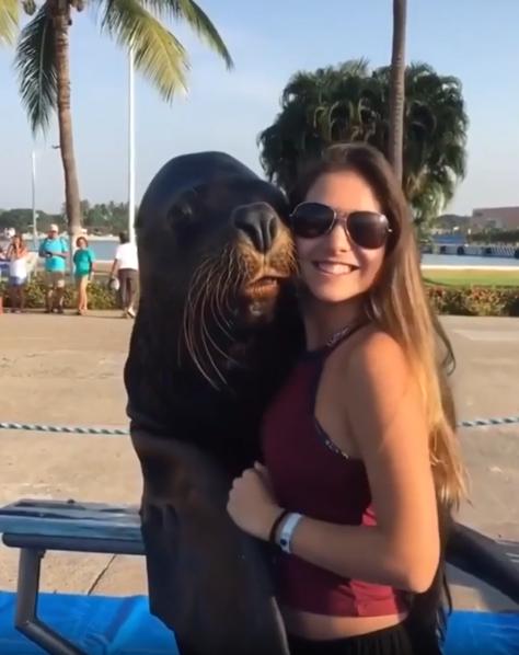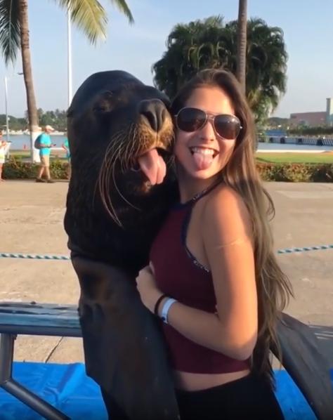 따사로운 햇살이 비치는 해변가, 푸른 바다를 배경으로 한 여성과 바다사자가 나란히 앉아 있습니다. 여성은 다정하게 바다사자에게 팔을 두르며, 둘만의 기념사진을 찍으려는 듯한 포즈를 취합니다. 평소라면 흔치 않은 장면이지만, 이 바다사자는 어쩐지 사람과 함께 있는 게 제법 익숙해 보입니다.