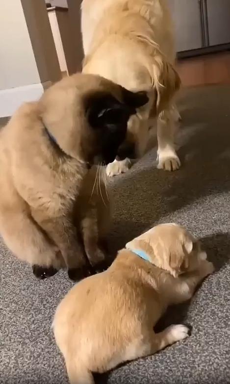 그런 강아지 앞에, 조용히 다가온 존재가 있습니다. 바로 고양이.