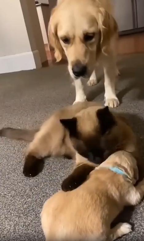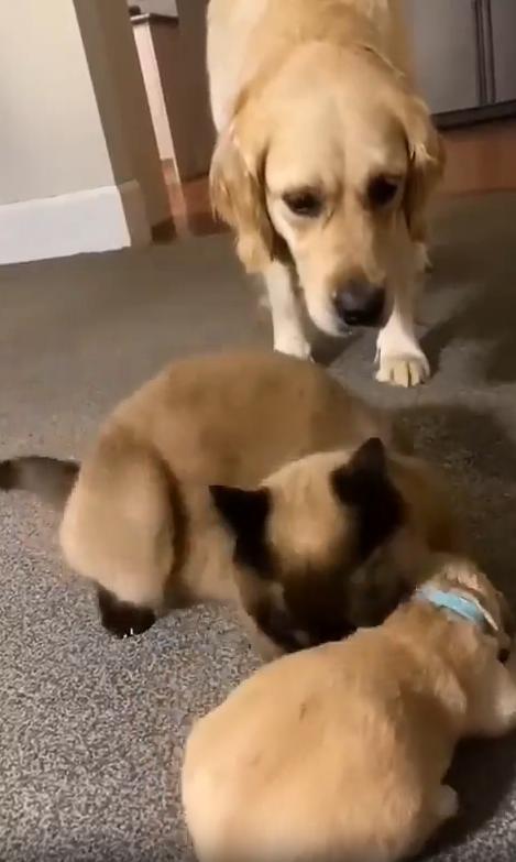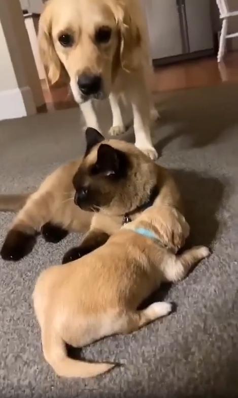 삼색이 빛을 띄는 고양이는 강아지를 바라보다가 조심스럽게 그 앞에 앉습니다. 그리고는 뭔가를 결심한 듯 천천히 몸을 낮추죠. 이어 고양이의 앞발 하나가 살포시 강아지의 등 위로 올라갑니다. 마치 "괜찮아, 나 여기 있어"라고 말하는 듯한 동작.