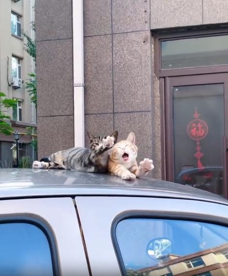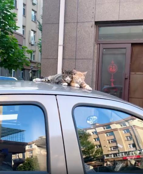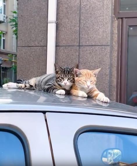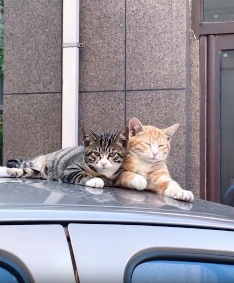 자동차라는 차가운 금속 위이지만, 그 위의 두 고양이는 말 그대로 ‘따뜻함’ 그 자체였습니다. 지붕 위는 마치 고양이들만의 작은 세계 같았고, 누구도 그 공간을 방해할 수 없을 듯한 고요함이 감돌았습니다.