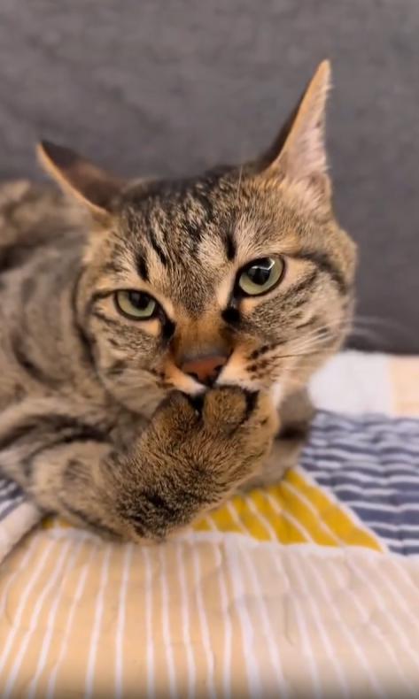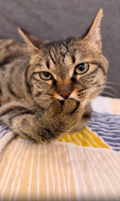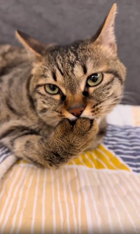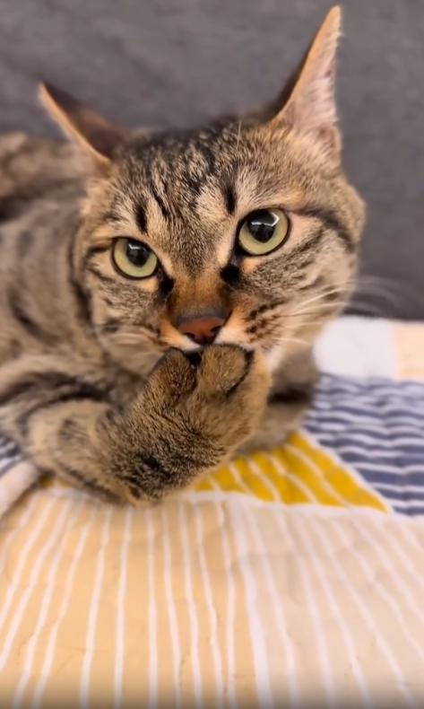 조명이 은은한 실내, 화면 속에는 카메라를 또렷하게 응시하는 고양이 한 마리가 등장합니다. 고양이의 눈은 뚜렷하고 고요하며, 마치 “찍어도 좋아, 하지만 난 지금 바빠”라고 말하는 듯한 태도를 보입니다. 그의 관심은 오직 하나—자신의 앞발.