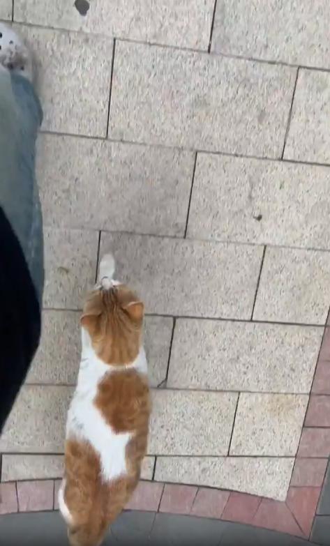 고양이의 이 행동은 단순한 애교가 아니었습니다. 분명히 ‘쓰다듬지 않고는 못 지나간다’는 의지를 담은 귀엽고도 집요한 시위였지요. 귀는 살짝 뒤로 젖혀지고, 눈은 커다랗게 뜨여 남성의 반응을 계속해서 관찰합니다. 마치 감정 표현에 있어서만큼은 인간보다 한 수 위인 듯한 절묘한 타이밍.
