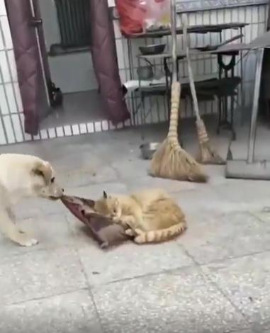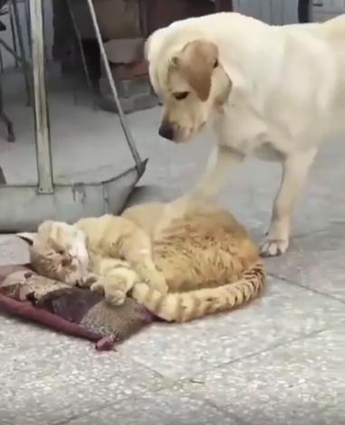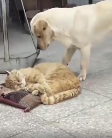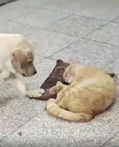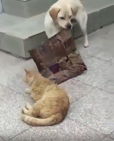 출처 : Reddit / 방석위에서 고양이가 누워서 자고있다 옆에 있는 강아지가 방석이 자기것인듯 입으로 물어 당겨보지만 고양이는 좀처럼 일어나질 않는다 몇번의 시도끝에 결국엔 강아지가 방석을 되찾는데 성공한다
