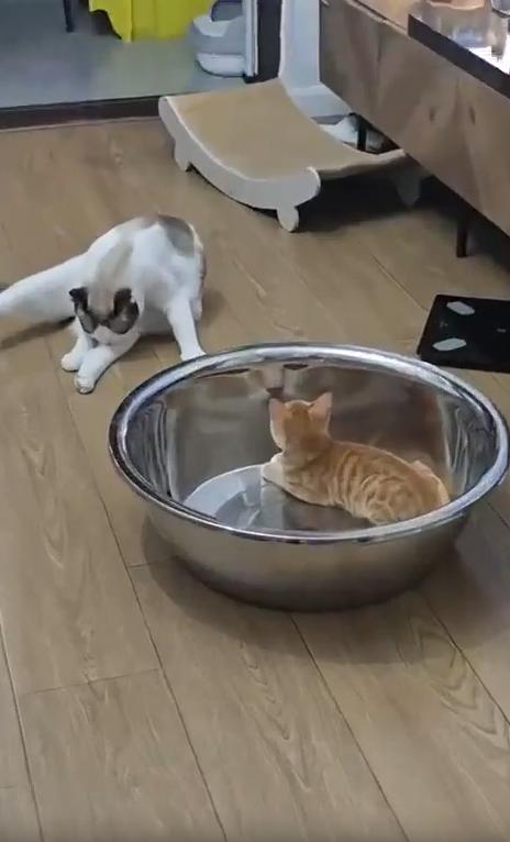 순간의 당황 이후에도 고양이는 몇 번 더 대야를 들여다봅니다. 혹시 방금 그 얼굴이 다시 나타나진 않을까? 두 눈을 조심스레 깜빡이며 경계를 풀지 않은 채 몇 발짝 뒤로 물러나, 다시 자세를 낮추고 천천히 관찰을 이어갑니다. 그렇게 아주 작은 몸짓 하나하나에 감정이 고스란히 담긴, 순수한 반응이 우리 앞에 펼쳐졌습니다.