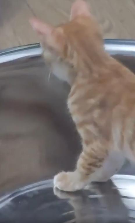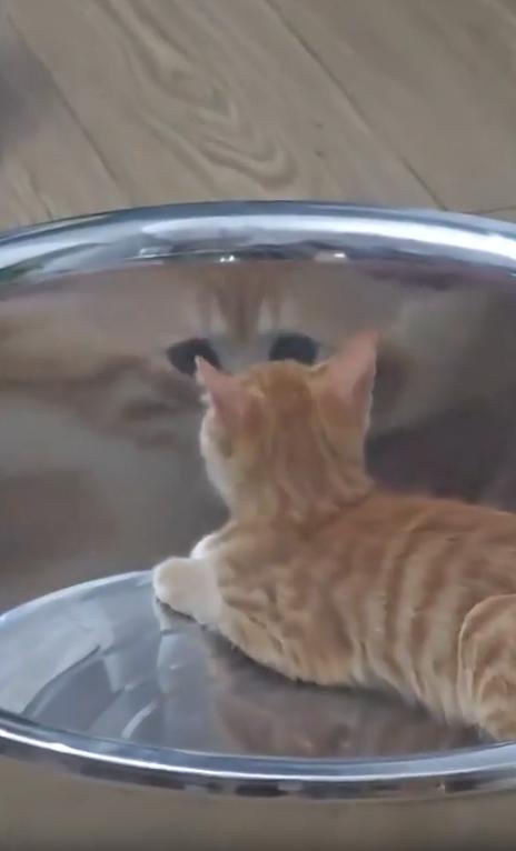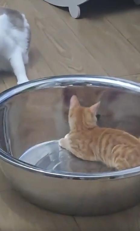 대야 안의 금속 표면은 마치 거울처럼 매끄러웠고, 고양이의 얼굴이 그 안에 동그랗게 비춰지고 있었죠. 하지만 그 얼굴은 평소보다 훨씬 더 커 보였고, 눈은 동그래지고, 입은 벌어진 채 어딘가 ‘심각한 표정’을 짓고 있었습니다.