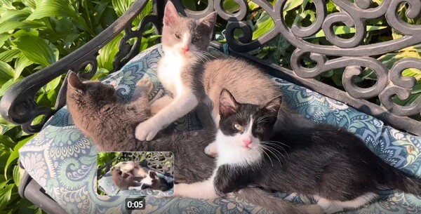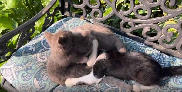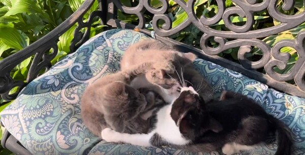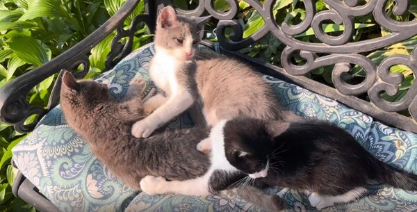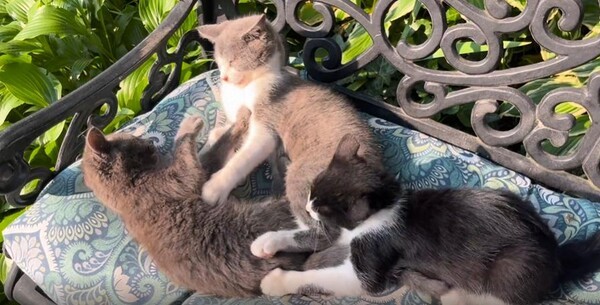 햇살이 부드럽게 내려앉은 마당 한켠, 야외 의자 위에 새끼 고양이 세 마리가 나란히 옆으로 누워 있었습니다. 폭신한 방석 위에서 쉬는 듯 보였지만, 고요함은 오래가지 않았죠. 가운데 있던 고양이가 갑자기 옆의 고양이 배를 앞발로 톡 치자, 그 순간이 장난의 시작이었습니다.