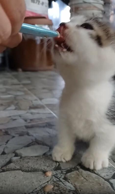 주인이 손을 조금 내밀자 고양이는 망설임 없이 혀를 내밀어 츄를 맛봅니다. 입술을 살짝 오므리며 츄를 받아먹는 그 모습에는 어린 동물만이 가진 순수한 신뢰가 묻어납니다. 한 입, 두 입 먹을 때마다 눈빛이 조금 더 부드러워지고, 꼬리는 천천히 좌우로 흔들립니다. 마치 ‘이 순간이 참 좋아요’ 하고 말하는 듯합니다.