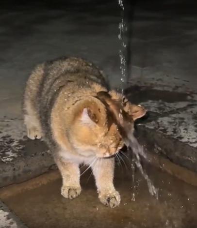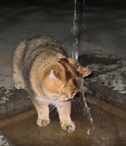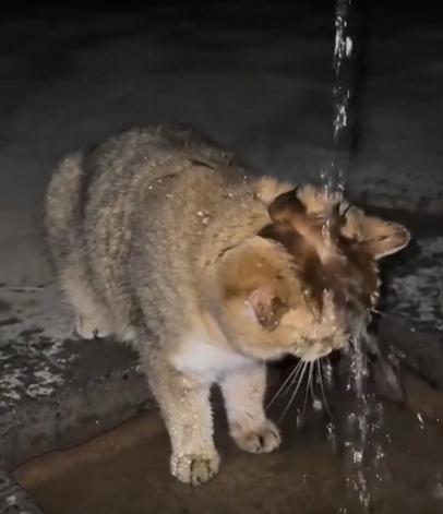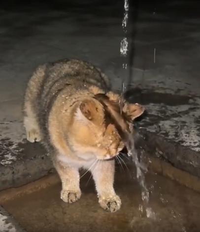 수도꼭지에서 물이 ‘또르르’ 하고 떨어지고 있습니다. 아주 가느다란 물줄기지만, 그 아래에는 고양이 한 마리가 조용히 자리를 잡고 있습니다. 고개를 살짝 들고, 정확히 물이 떨어지는 위치에 이마를 맞춘 채 꼼짝하지 않습니다.