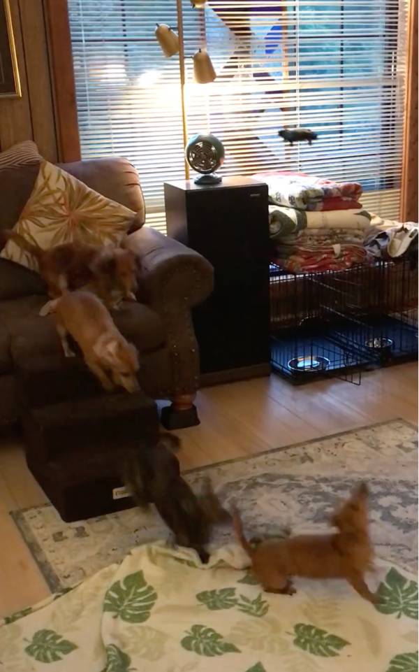 드론이 옆으로 날자, 소파에서 우르르 내려온 닥스훈트들이 드론을 따라갑니다. 그 모습이 마치 드론의 뒤꽁무니를 졸졸 쫓아가는 모양새인데요. 드론에 닿기 위해 강아지들은 점프도 해 보지만, 짧은 다리로는 한계가 있는 듯 보입니다. 또한 드론은 강아지들이 점프해 자신에게 닿으려 할 때마다 능숙하게 높이를 조절해 닿지 못하게 하죠. 마치, 다리가 짧아 점프 높이도 낮은 닥스훈트들을 드론이 약 올리는 것처럼 보이기도 합니다.