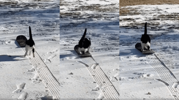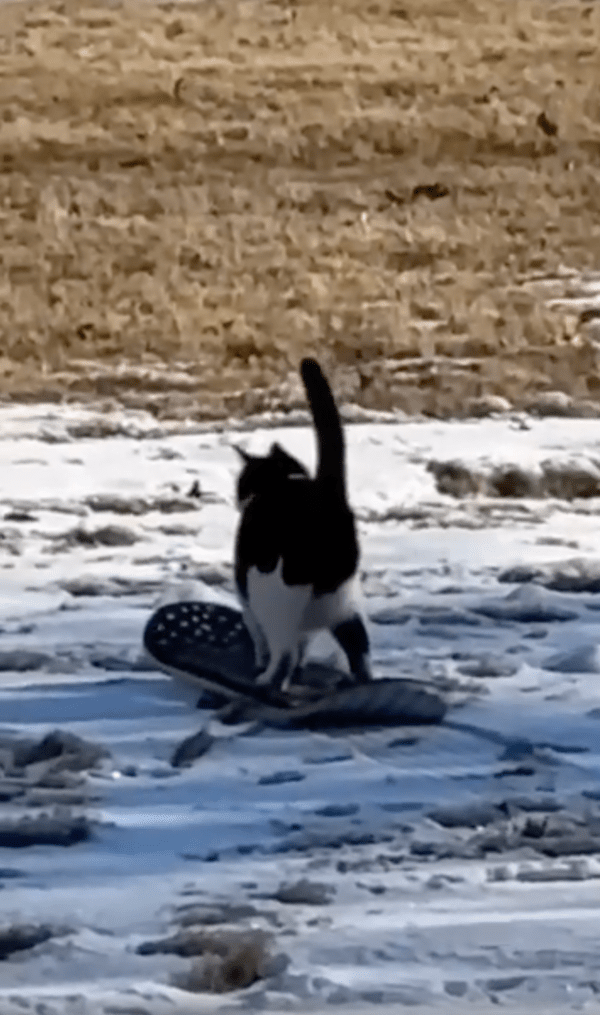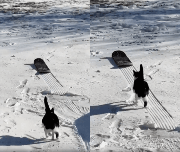 고양이는 스노우보드 위에 올라탄 후에도 균형을 잘 잡고, 마치 신나게 즐기는 듯한 표정을 지으며 내려가는 모습을 보여줍니다. 전혀 무섭지 않아 보이는 이 고양이가 스노우보드를 어쩜 이렇게 능숙하게 탈까요? 이 보드를 타고 어딜 가는 걸까요?