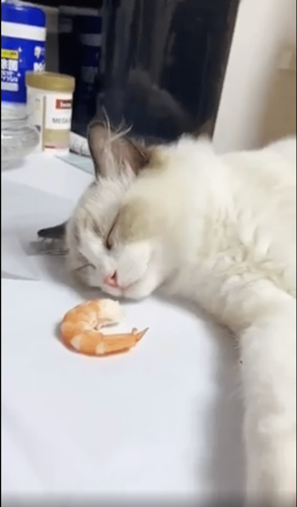 고양이의 사랑스러운 일상이 다시 한번 많은 이들의 마음을 따뜻하게 하고 있습니다. 한 고양이가 깊은 잠에 빠져 있었는데, 그 앞에 주인이 새우를 조심스럽게 내려놓았습니다.