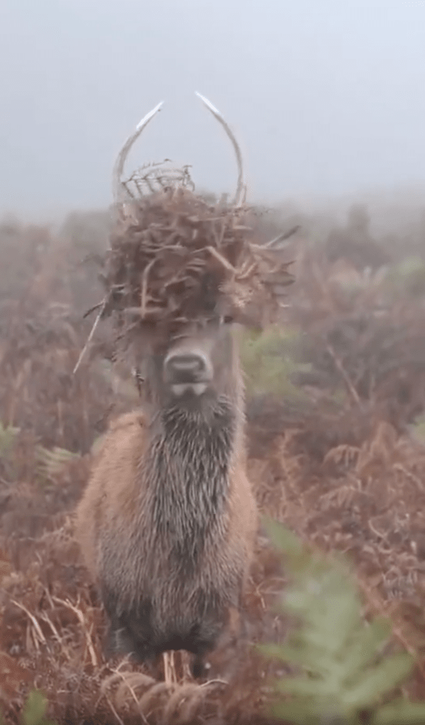 숲속의 고요함을 깨고, 한 사슴이 덤불 사이에서 머리를 숙인 채 움직이고 있었습니다. 머리를 좌우로 흔들며 무언가를 확인하려는 듯한 모습은 사뭇 진지해 보였습니다. 그런데 이 사슴이 갑자기 고개를 들어 올리자, 뿔 사이에 덤불 속 나뭇가지들이 엉켜 있는 것이 보였습니다.