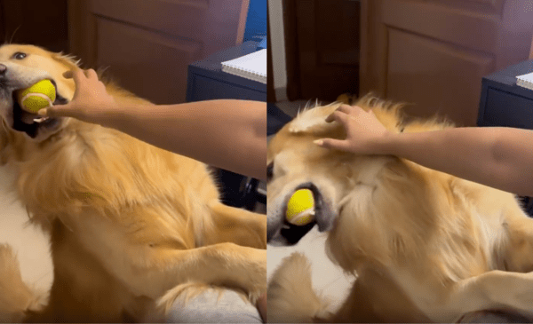 강아지가 공을 물고 주인과 실랑이를 벌이는 모습은 웃음을 자아냈습니다. 주인은 공을 가져가려고 손을 뻗었지만, 골든 리트리버는 이내 머리를 뒤로 젖히며 공을 더욱 꽉 물고 놓지 않았습니다. 이러한 상황이 몇 차례 반복되자 주인은 결국 강아지의 의지를 꺾을 수 없음을 인정하고 공을 포기하고 말았습니다.