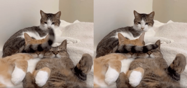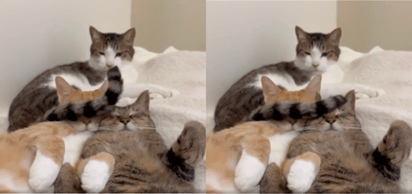 영상 속에서 두 고양이는 편안히 잠든 자세로 누워 있습니다. 하지만 그 위에 자리 잡은 고양이는 자신의 꼬리를 이용해 마치 “눈가리개”라도 되듯 두 친구의 눈 위에 꼬리를 살짝살짝 휘저으며 장난을 칩니다.