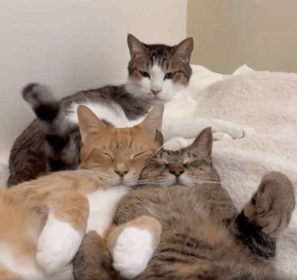 눈을 감고 있던 두 고양이는 이 상황에도 미동조차 하지 않으며 여전히 깊은 잠에 빠진 듯한 모습을 보여주는데요. 정말 자는 건지, 아니면 일부러 반응하지 않는 건지 알 수 없습니다.