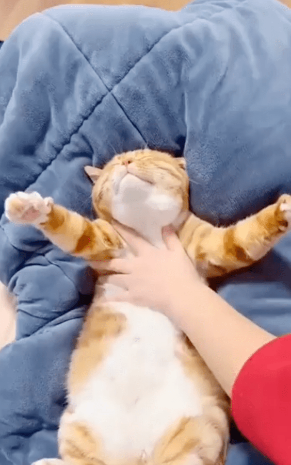 고양이는 본능적으로 복부를 민감한 부위로 여깁니다. 따라서 복부를 드러내고 쓰다듬게 하는 것은 자신을 전적으로 믿고 있다는 증거라고 합니다. 특히 주인의 손길이 부드럽고 안정감을 주었기 때문에 고양이가 마음을 완전히 열고 평온한 상태에 도달한 것입니다.