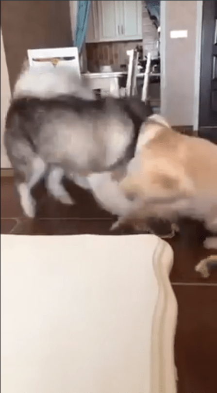 실내 한가운데에서 두 마리의 큰 개가 장난스럽게 티격태격하고 있습니다. 서로 몸을 밀치고, 가볍게 입을 벌리며 장난을 치지만, 격렬한 움직임에 점점 주변이 소란스러워집니다. 그런데 이 상황을 조용히 지켜보던 한 마리의 고양이가 있습니다.