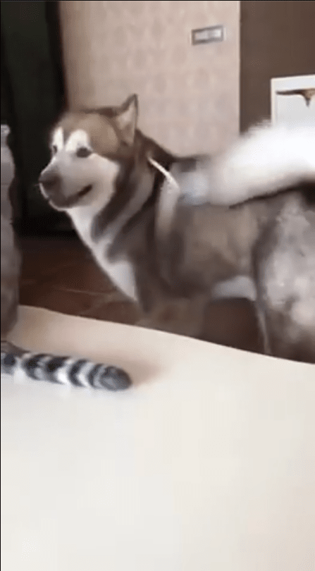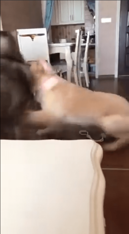 고양이는 테이블 위에서 꼿꼿이 앉아, 모든 상황을 지켜보고 있었습니다. 싸움이 점점 격해지자, 마치 “이제 그만해야겠는데?”라는 듯한 표정을 짓습니다. 하지만 개들은 여전히 장난을 멈출 생각이 없는 듯합니다. 그리고 결국, 고양이가 있는 테이블 가까이까지 다가오고 말죠.