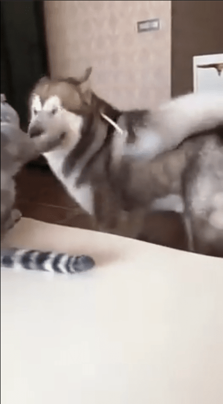 툭—! 강력한 고양이의 따귀 한 방이 개의 얼굴을 정확히 강타합니다. 예상치 못한 공격에 개는 순간적으로 움찔하며 멈춰 서고, 옆에 있던 다른 개도 함께 긴장하는 듯합니다. 고양이는 마치 "질서는 내가 세운다!"라고 선언하듯 테이블 위에서 당당한 자세를 유지합니다.