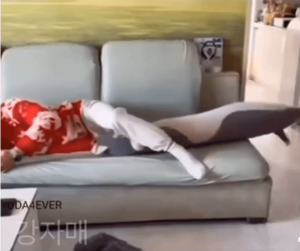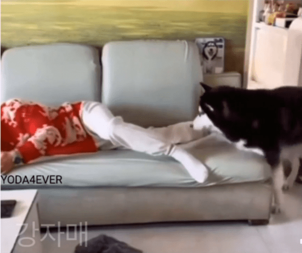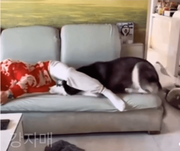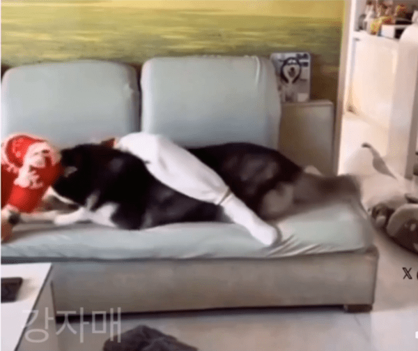 소파 위, 주인은 긴 쿠션을 꼭 끌어안고 편안하게 누워 있습니다. 쿠션을 부드럽게 감싸 안고 있는 모습은 마치 그게 세상에서 가장 포근한 존재라도 되는 듯 보입니다. 그러나 이 모습을 유심히 지켜보던 존재가 있습니다. 바로 허스키입니다.