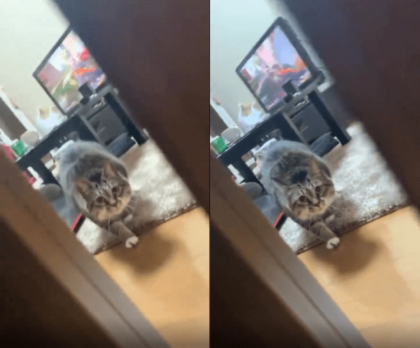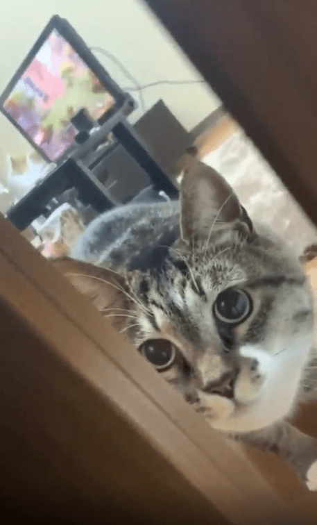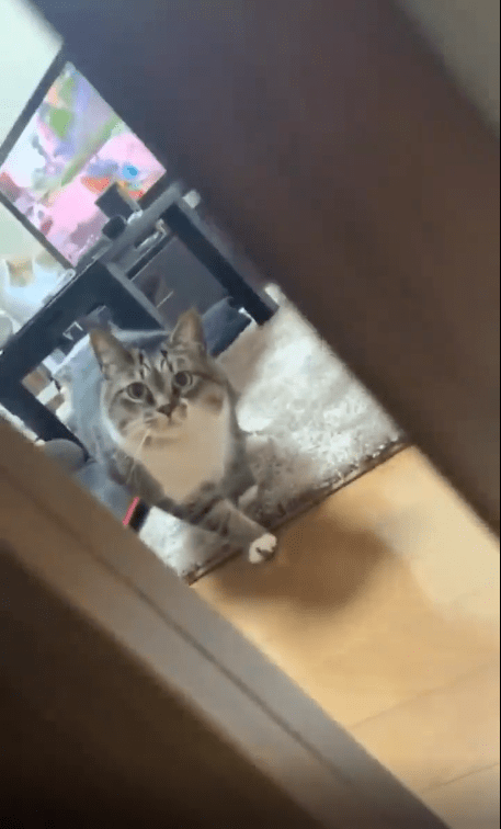 방 문 앞, 주인은 살짝 몸을 움직여 방 안을 들여다봅니다. 그리고 그 순간, 방 안에 있던 고양이 한 마리가 가만히 서 있습니다. 움직임 없이 주인만을 뚫어지게 바라보고 있는 모습이 묘하게 긴장감을 자아냅니다.