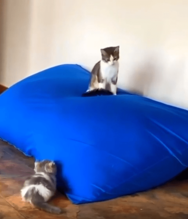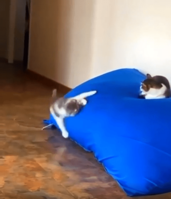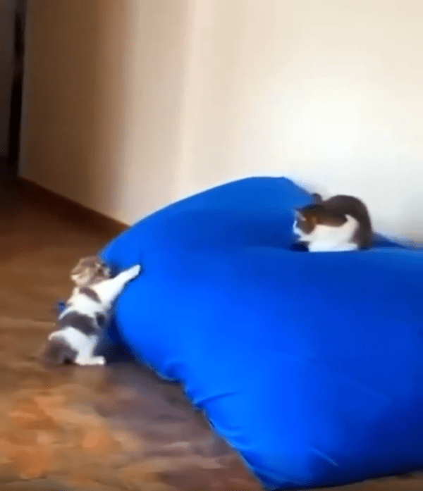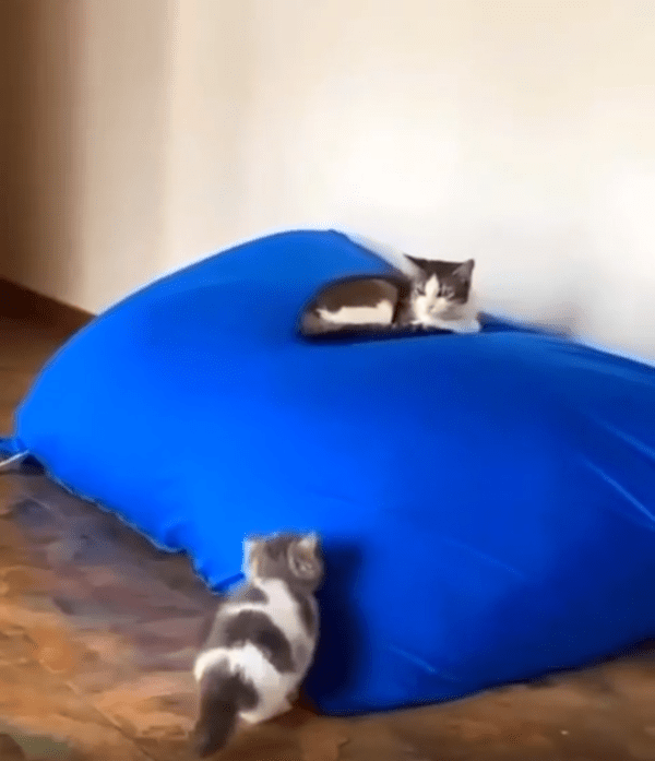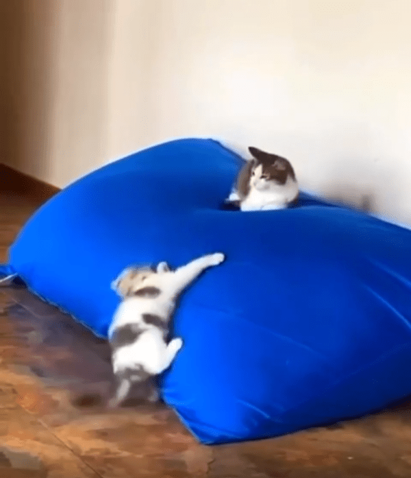 파란 쿠션 위에는 한 마리의 고양이가 엎드려 편안하게 누워 있었습니다. 아무런 위협도 느끼지 못한 채, 마치 이 쿠션이 자신의 왕좌라도 되는 듯 태연한 모습이었죠. 하지만 바로 그 아래, 작은 고양이가 몸을 바짝 웅크린 채 엉덩이를 살랑살랑 흔들고 있었습니다. 이건 분명 기습을 준비하는 자세였습니다.