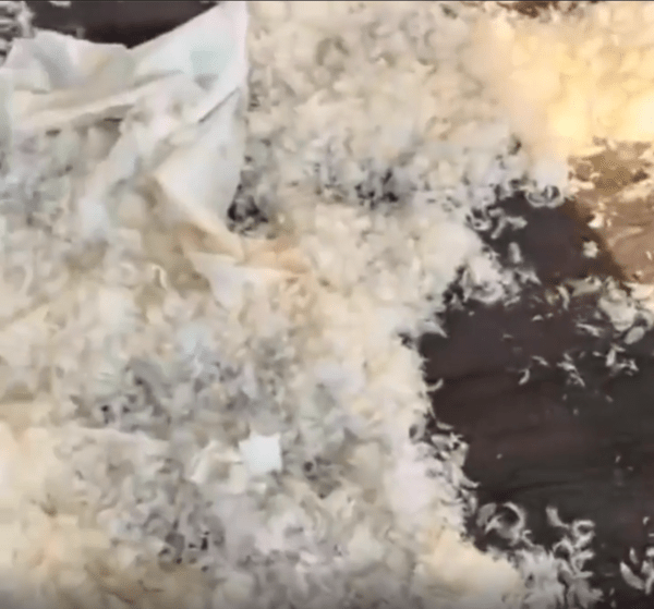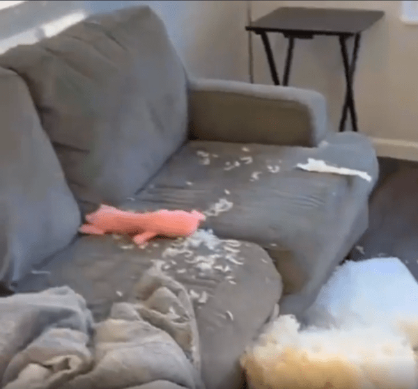 문을 열자마자 눈앞에 펼쳐진 충격적인 광경. 소파 쿠션이 완전히 뜯겨 나가고, 바닥은 하얀 깃털로 뒤덮여 있습니다. 마치 한바탕 폭풍이 휩쓸고 간 듯한 모습입니다.