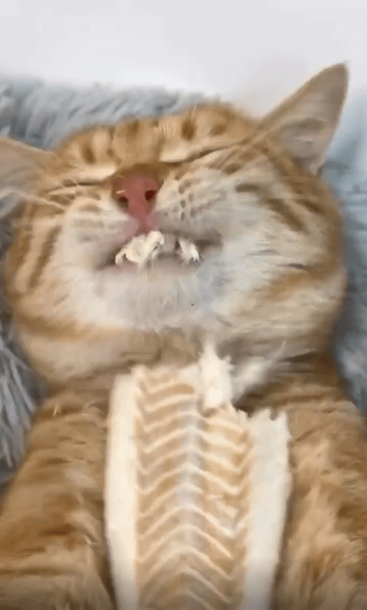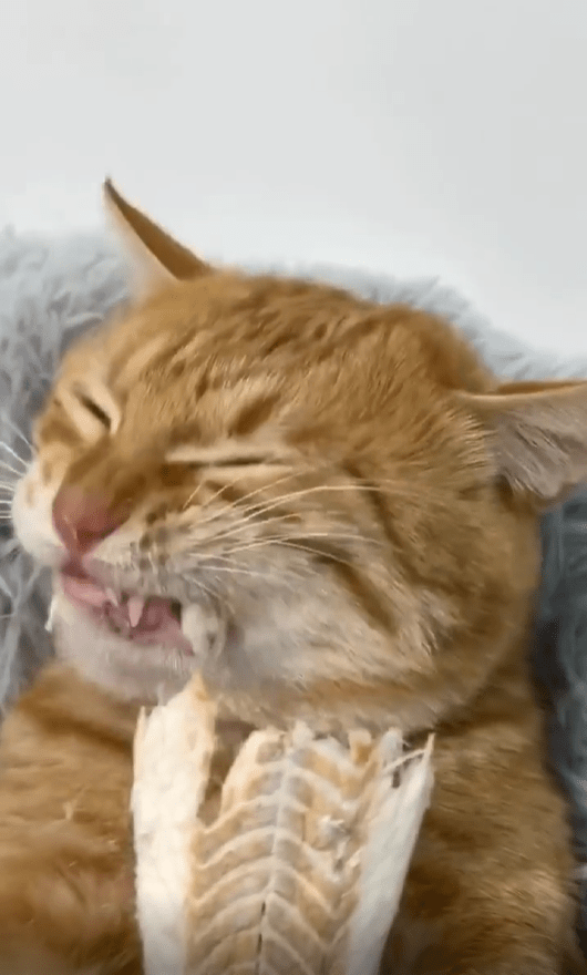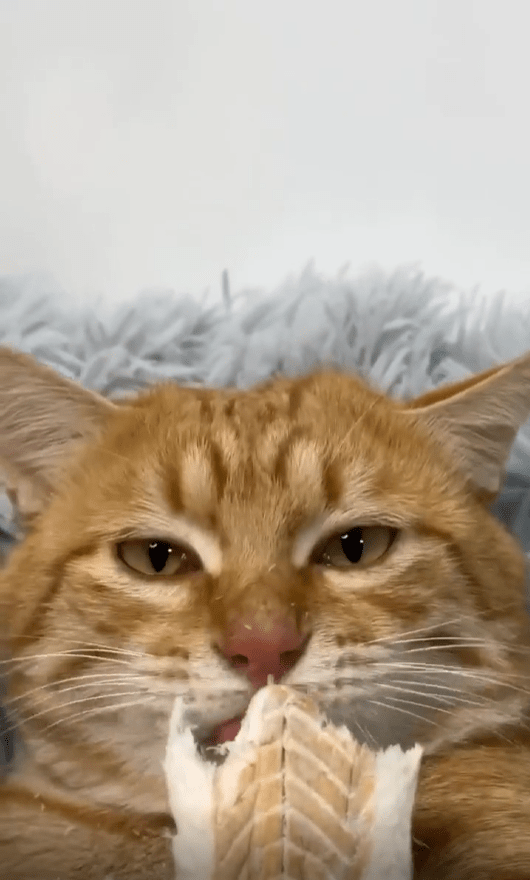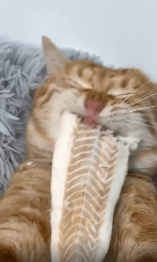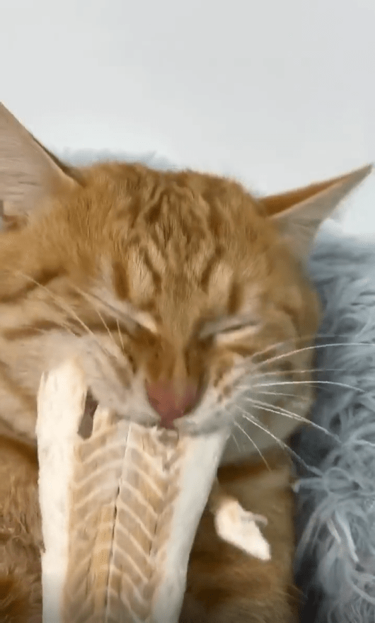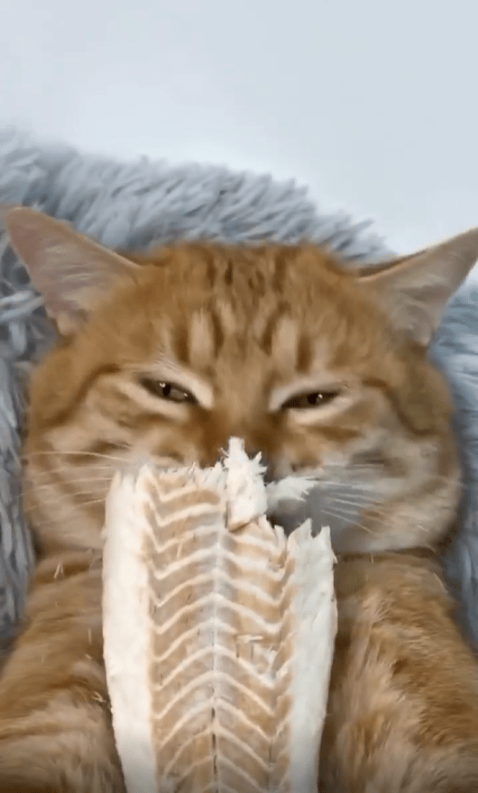 가끔은 너무 신이 난 듯, 앞발로 생선살을 조금 더 꽉 움켜쥐었다가 다시 입으로 가져가는 모습도 보였습니다. 혹시라도 손에서 빠져나가면 안 된다는 듯 단단히 쥐고 있었고, 한 입이라도 더 먹기 위해 자연스럽게 얼굴이 따라 움직였습니다. 화면 속에서는 오직 먹는 것에 집중한 고양이의 모습만이 가득 차 있었습니다.